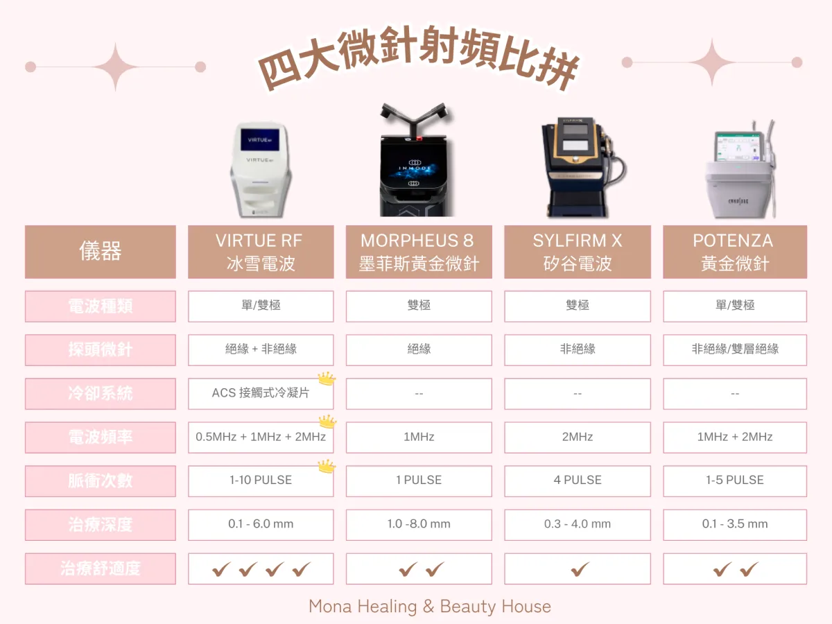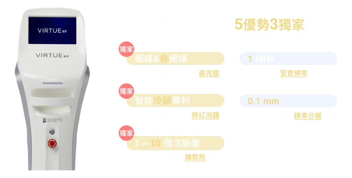 Virtue RF (神比微針電波/ 冰雪電波) 是一種來自韓國的第3代黃金微針射頻設備,通過美國FDA、歐盟CE及台灣TFDA認證。它利用24K金微針將雙極電波能量精準傳導至真皮層與皮下組織,刺激膠原蛋白與彈力蛋白再生。這項技術具有「接觸式冷卻系統」與「絕緣/非絕緣針」可選,主打低痛感、短修復期,能有效緊緻提升、改善毛孔、細紋、凹疤及妊娠紋。
